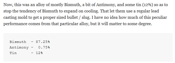 ビスマスを主成分とし、アンチモンとスズ(12%)を加えた合金で、ビスマスが冷却されると膨張する性質があるため、この合金を使用したのです。そのため、通常の鉛の鋳型を使って、適切な大きさの弾丸やスラグを作ることができたのである。この特殊な性能が、この特殊な合金にどれだけ由来しているかは分からないが、ある程度は重要だろう。